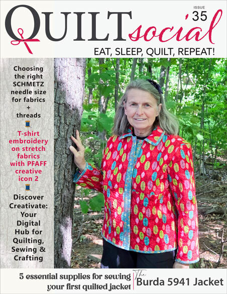 QUILTsocial Issue 35 is dedicated to precision sewing, smart tools, and creative confidence. Discover how SCHMETZ needles can transform your stitching, from choosing the correct size and type to mastering twin needles and specialty options paired with Gütermann threads. Explore digital creativity with Creativate software and the Momento cutting machine for quilting, appliqué, and embroidery design. Follow a complete quilted jacket series using Burda Pattern 5941, from preparation to final assembly. Finish with expert guidance on embroidering knits using the PFAFF creative icon 2, including hooping, lettering, and satin stitch techniques.